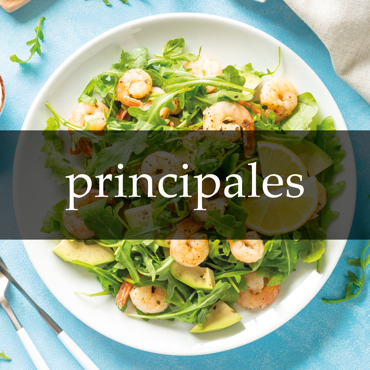 Hojas verdes, palta, langostinos,